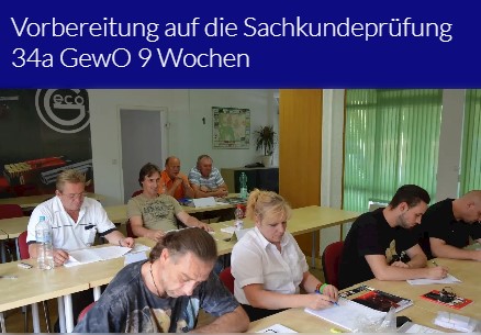 Maßnahmedauer: 9 Wochen Unterrichtszeiten: Vollzeit von Montag bis Freitag Ausbildungsinhalte: - Vorbereitung auf die Sachkundeprüfung nach §34a GewO - Erste Hilfe - Brandschutzhelfer