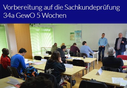 Maßnahmedauer: 5 Wochen Unterrichtszeiten: Vollzeit von Montag bis Freitag Ausbildungsinhalte: - Vorbereitung auf die Sachkundeprüfung nach §34a GewO - Erste Hilfe - Brandschutzhelfer